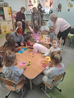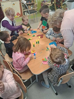 Dużo radości przyniosły również zajęcia manualne, w tym przygotowywanie laurek z okazji Dnia Babci i Dziadka. Z wstępnie przygotowanymi kartkami Seniorzy udali się do przedszkola w Wietrzychowicach, do najmłodszej grupy „Pszczółki”. W serdecznej atmosferze, dzieci wspólnie z Seniorami, ozdabiały laurki, bawiąc się przy tym doskonale. Zajęcia te sprzyjały wzajemnej integracji i podtrzymaniu więzi międzypokoleniowych.