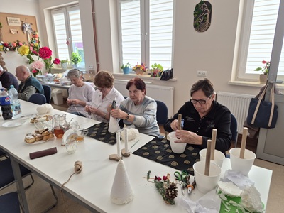 W listopadzie uczestnicy klubu zaczęli już przygotowania do robienia stroików bożonarodzeniowych które będą wręczać zaproszonym gościom podczas wigilii w grudniu. Powstały bardzo ciekawe i kreatywne prace. Seniorzy w ramach zajęć plastycznych wykonywali także własnoręcznie kartki świąteczne dla gości oraz zaproszenia. Seniorzy zakończyli także prace plastyczne przy dużych rozmiarów kompozycji kwiatów, która jest ozdobą klubu.