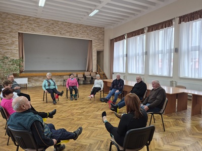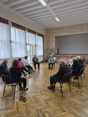 W tym miesiącu nie brakowało również aktywności fizycznej. Klubowicze ćwiczyli „gimnastykę krzesełkową” pod czujnym okiem Pani Beatki – rehabilitantki. Do ćwiczeń wykorzystywali taśmy gumowe oraz ciężarki.
